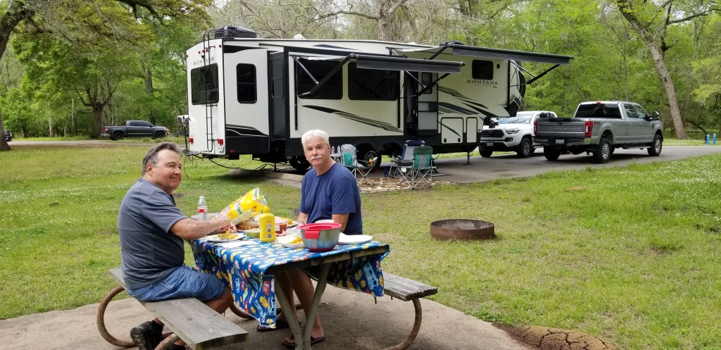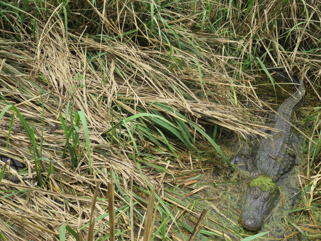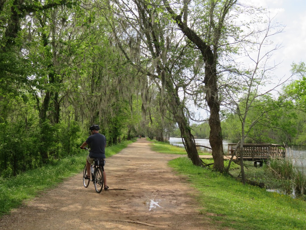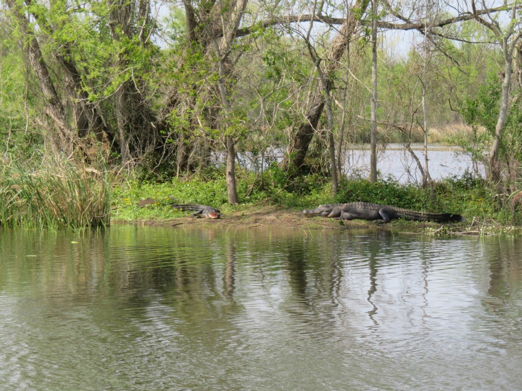 Our drive from Galveston wasn’t long. This park is just southeast of Houston. As soon as we had Frodo and Sam settled in, we took off for a bike ride. Elm Lake Trail went around the largest lake and through the marshes and promised our best chance of seeing wildlife. It didn’t take long for our first alligator sighting: