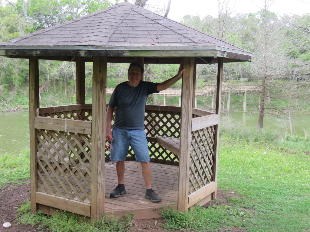 After lunch, Jared and I were ready for a walk. Then, after some more visiting, we decided to walk again. The bike ride was 4 miles, and then in total he and I walked 5.3 miles. Not bad for a man who is getting ready to celebrate his 80th birthday! On the bike ride, we happened to talk to a man who was fishing. “No luck this morning,” he said. We enjoyed the view for awhile longer, and as we turned to leave, he had caught a nice-sized bass. We all decided that we had brought him the good luck that he needed. While we were looking at the view, we saw a gazebo, and it was the gazebo that Jared wanted to hike to on our second walk.