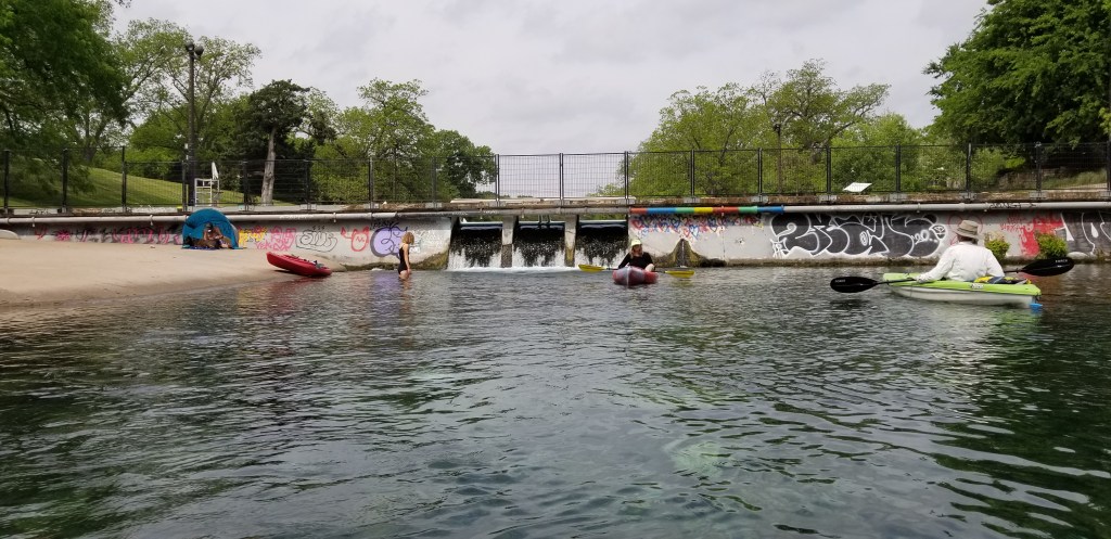 Today’s adventure at Zilker, however, was about kayaking. We canoed here, long ago. My experiences with canoeing over the intervening years have mostly led to wet hair and lost equipment, including shoes, so I decided long ago that canoes are best avoided. This was only our second time kayaking, and it we both enjoyed it.