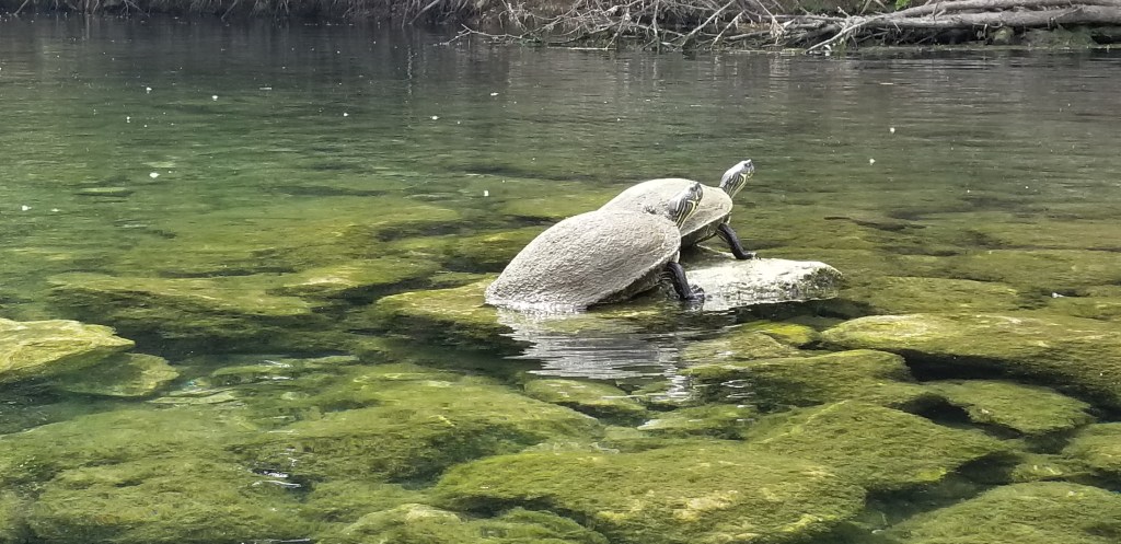 We started out on Barton Creek. The first thing I noticed was all the turtles. Turtles swimming next to us, turtles sunning on rocks, turtles jockeying for space on logs. They climb onto the lowest part of the log, and the whole crowd slooooowly moves forward. It’s a fair system–the first one on eventually gets pushed back on the water, like a game of musical chairs.