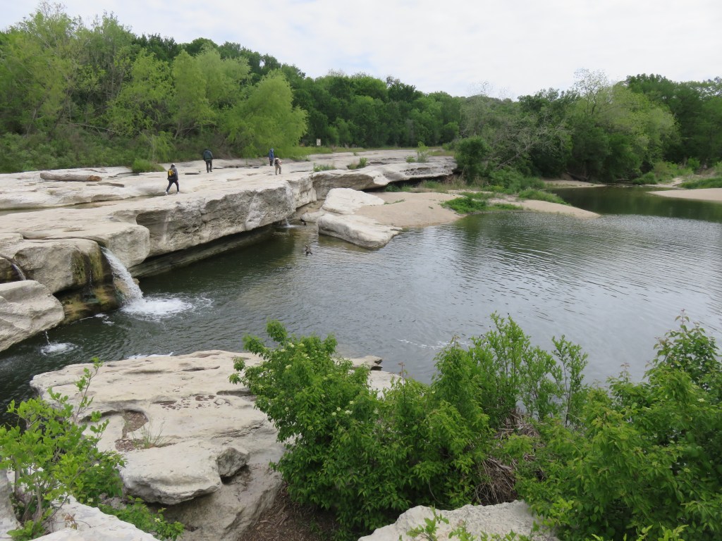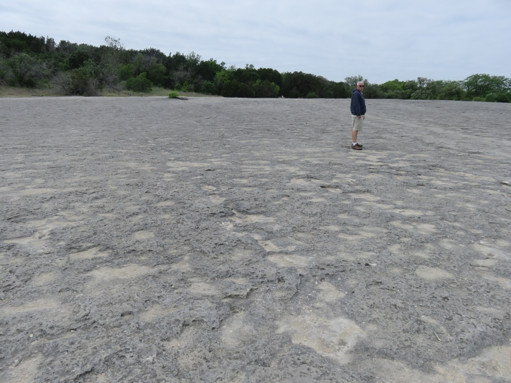 The picture above shows Onion Creek flowing over limestone ledges as part of the Lower Falls. This was an important river crossing for natives, traders and settlers for centuries. Below, the massive area of limestone was part of a 2,500 mile road, called El Camino Real, that stretched from Mexico to Louisiana. I could just see wagons massed here waiting to make the river crossing, and once again had that history-beneath-my-feet feeling. Cal obligingly stood there for me so you can get a sense of just how large an area it is. In rainier times, this would be covered with water.