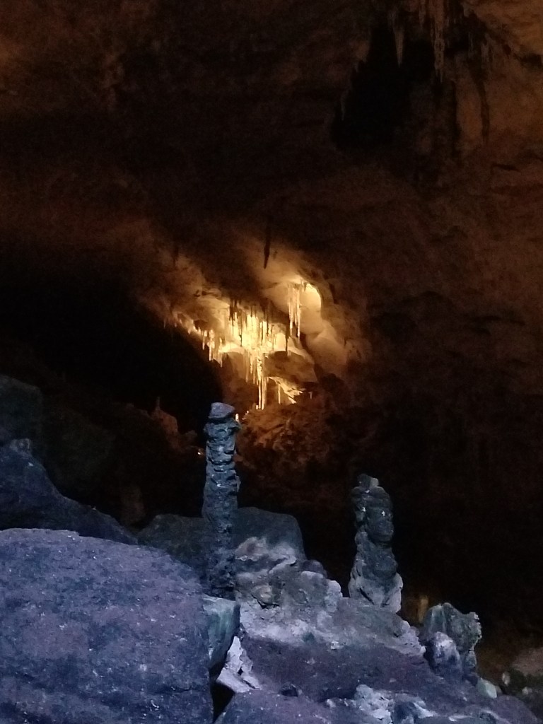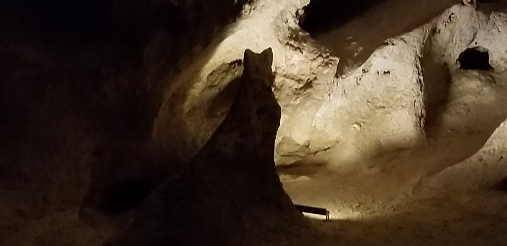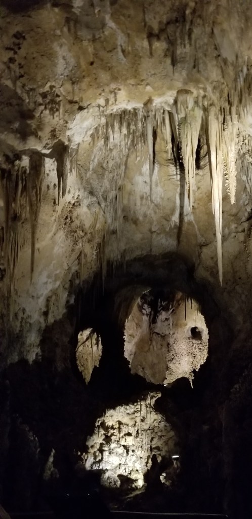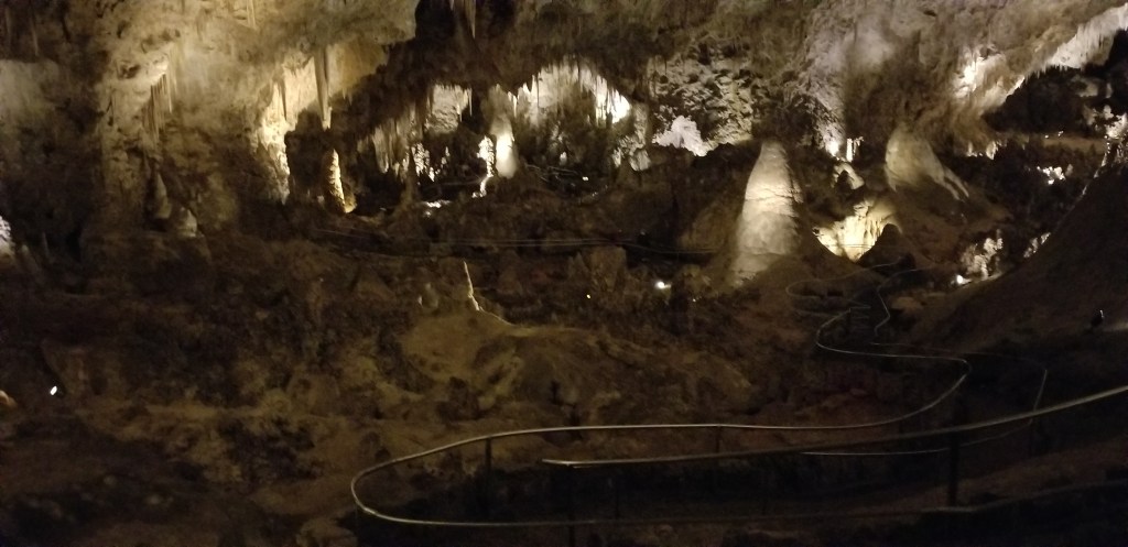 My parents took me on cave tours from a young age and I loved to go. We lived not too far from one in Ohio, where I grew up, and I loved exploring deep under the ground and looking at huge cave formations. I learned that stalactites “hold on tight” to the cave ceiling, and come down from above, and stalagmites grow from below. Both are formed from drips of water over millenia, and are easily interrupted in their formation by the simplest human touch. Back in the day, the cave formations were given cute little names, like “Bacon and Eggs” or “The Pipe Organ”. Most of the cave tours I’ve been on recently focus on the scientific and conservation aspects of cave growth and preservation, and that’s a good thing. However, I noticed that Carlsbad couldn’t help but sneak in a few names for their formations. The sweeping panorama in the picture above was called “Fairyland” and the one below was a “Whale’s Mouth”, with cave formations of draperies and flowstone.