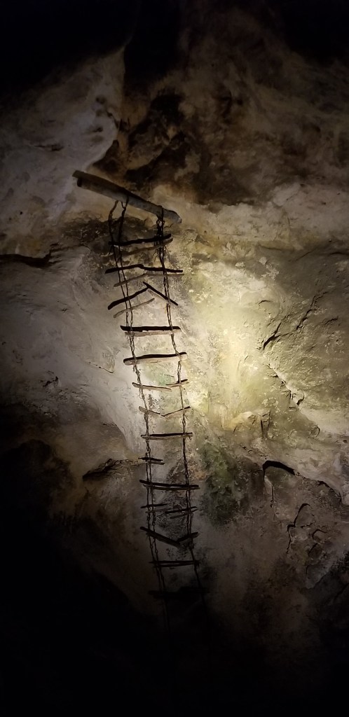 The park literature will tell you that “Carlsbad Cavern is one of over 300 limestone caves in a fossil reef laid down by an inland sea about 265 million years ago. Twelve-to-fourteen thousand years ago, American Indians lived in the Guadalupe Mountains.” Spanish and European settlers may have entered the cave, but the first credited exploration was by Jim White in 1898. Jim was a cowboy who found the cave by accident; he thought he saw a wildfire in the distance, but upon closer examination saw that it was thousands of Brazilian ring-tailed bats exiting the cave. He returned later with some wire, wood, and a light source, and began exploring it. You can see his ladder in the picture below. Jim spent the rest of his life exploring the cave and guiding others through it. In 1923 he guided the General Land Office for surveying and mapping the cavern, and it became a national park in 1930 after first becoming a national monument.