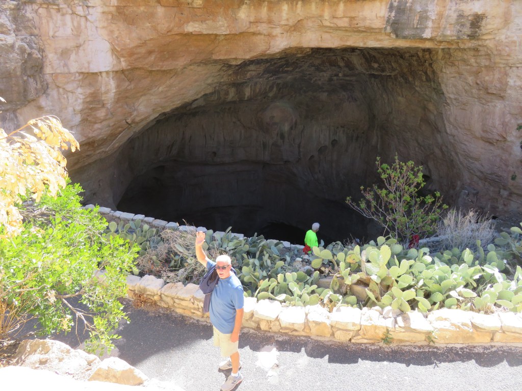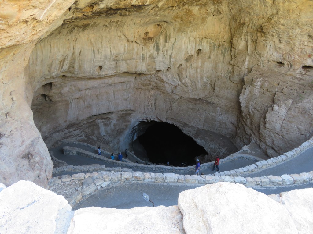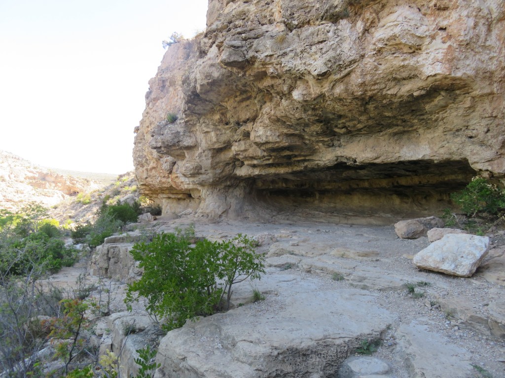 Carlsbad Caverns lies underneath the northern end of the Guadalupe Mountains, on the New Mexico end. The park was our destination for the day after our Guadalupe hike, and was not too far from our camping site at Chosa. We had to make reservations for our time slot and because it took less time than we anticipated to get into the park, we stopped at a “point of interest” along the way. It was a little trail to a rocky overhang used for millenia as a shelter for humankind. The roof of the overhang was blackened by multitudes of campfires over the ages. From the overhang, we could see across the road to more shallow caves.