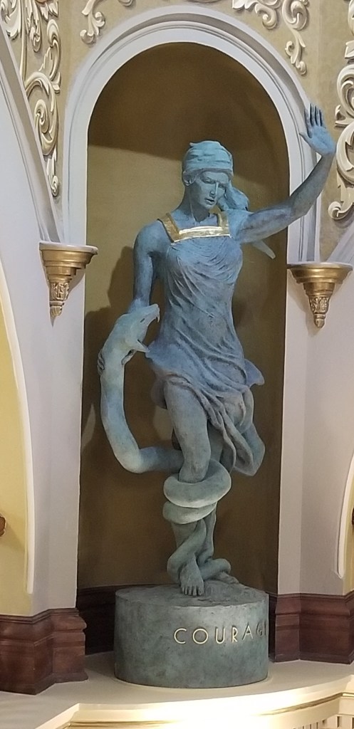 A docent who was eager to talk to us was proud of a renovation that was done not too long ago. It was the first one since the building was completed back in 1888. They don’t rush into things in Wyoming. There were 4 niches built into the walls for a statues, and these were finally added in 2019. Together, the 4 statues are “The Four Sisters” and they are Truth, Justice, Courage, Hope. Courage is pictured below. I guess it does take a lot of courage to hold a snake.