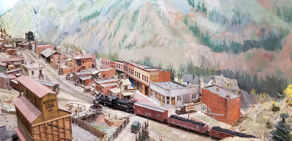 The train depot had a museum that was interesting, but the thing that got my attention was a huge model train set on the second floor, one man’s 35-year labor of love. He constructed all the buildings and hand-painted the backdrops. This picture just shows one small part of it. The train was running through the whole thing.