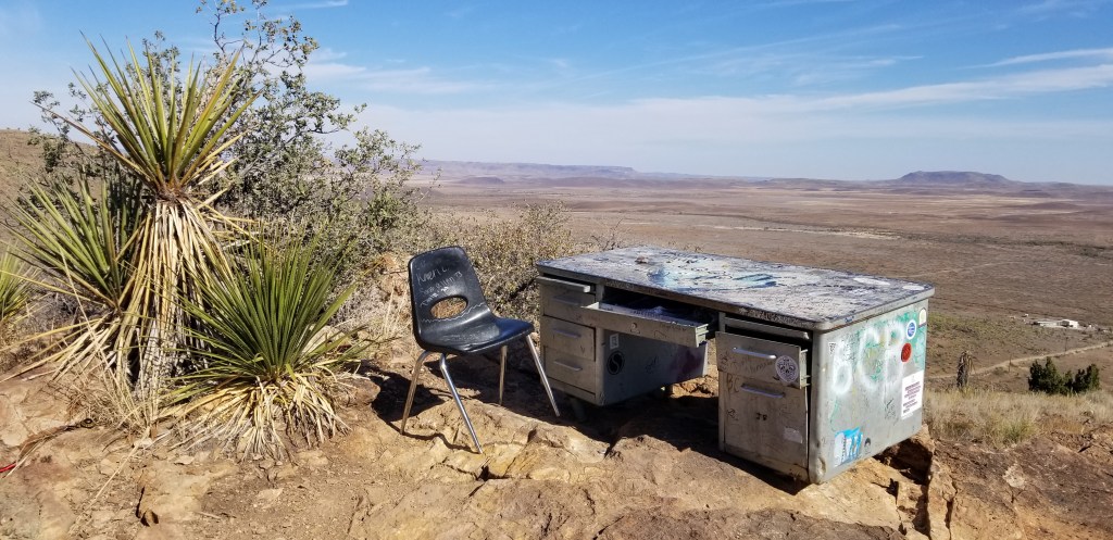 Back in the Eighties, three students decided they needed a quieter place to study than their dorm rooms at Sul Ross University. They hauled a desk and a chair all the way up the hill behind their dorm. They greatly enjoyed their spot and spent a lot of time up there. One of them accidently left his notebook in the desk, and when he returned for it, he was surprised to see a hiker had signed it. The notebook, the desk, and the chair became the stuff of legends. By now the desk has been replaced two or three times and there are several filled notebooks in a museum. I kept running into suggestions to “Hike to The Desk” in my research for this area of Texas, so we did.