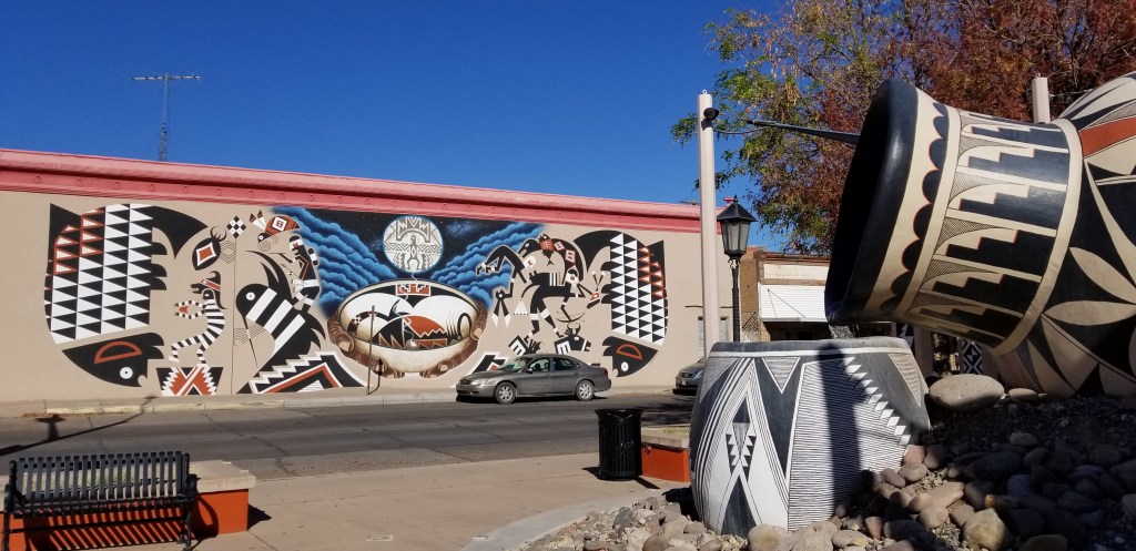 The Mimbres people lived in this area as far back as 1000 AD. Their pottery is something Deming is very proud of, as can be seen in this mural and fountain in downtown Deming: