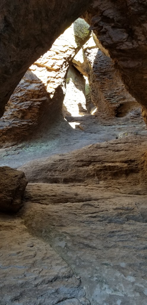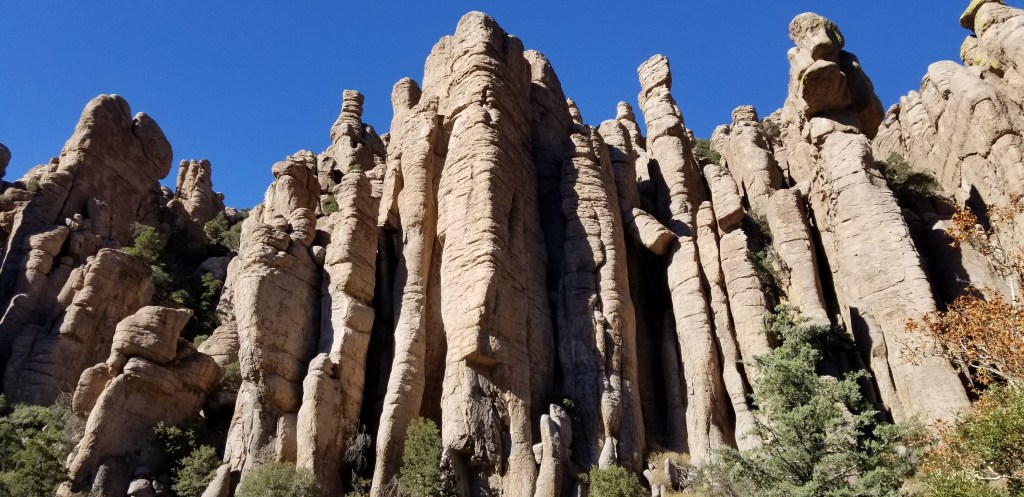 What softened the blow for having to stay in Willcox was being able to visit Chiracahua National Monument, 40 miles away. We lived in Arizona for a couple of years back in the 80’s, and one of our favorite tent-camping stories is from a weekend we spent there. One evening, a pair of skunks wandered through our site while we were sitting in our lawn chairs. We froze in place, not daring to move, as they sniffed around and actually passed right underneath us. We were lucky we didn’t get sprayed! It was fun to drive through the campground again, a wooded oasis right under the tall rock cliffs, but we wouldn’t be able to stay there in our 5th wheel. Chiracahua is an other-worldly, magical place: