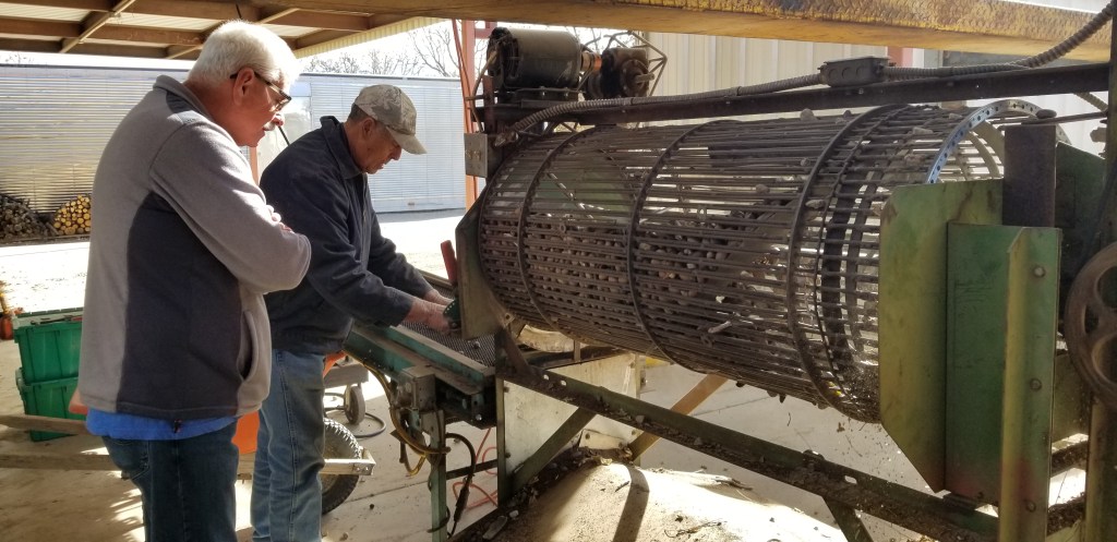 The nuts can’t be harvested until all the trees lose their leaves. Some nuts fall in the process, so when the leaves are raked, Paul puts everything (minus the leaves) into this separator to get the rocks and other debris out. He welded this contraption together himself, like so much of his equipment.