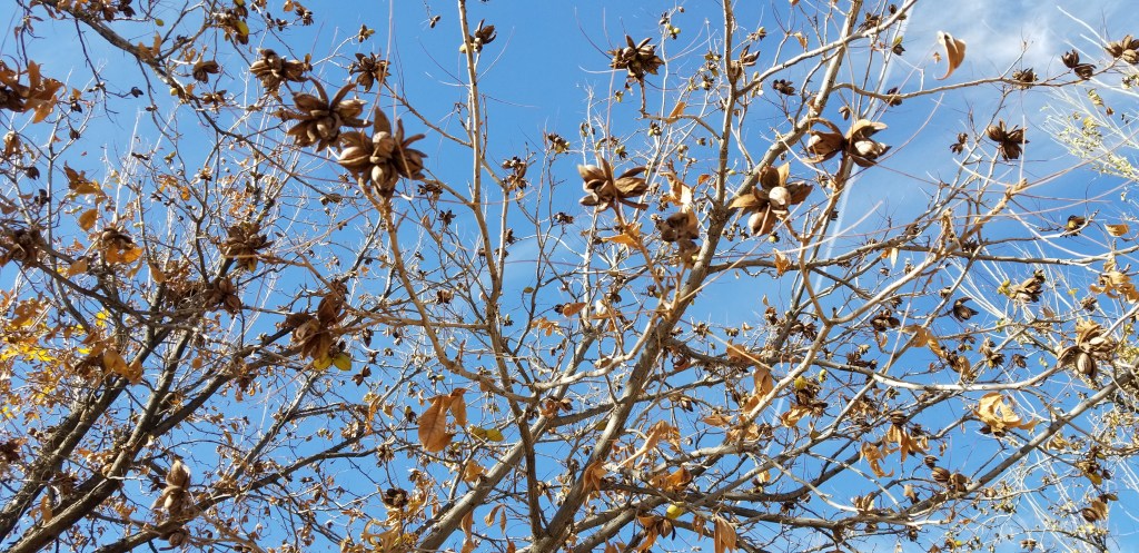 Starting in Roswell, New Mexico, but also in southwest Texas, southern New Mexico, and now Arizona, we saw a lot of pecan farms. In Roswell in early November, the leaves were still green on the trees. By the time we got to Texas, the leaves that we saw on the trees were changing color. There was a farm near our KOA, so we had a nice chat with Paul and Jackie Lee. They were happy to take us around. I’m munching on their pecans as I write. In mid-December, they were only three weeks away from harvest. This is a very small operation, so they send the picked nuts out to New Mexico and Texas for processing, then the shelled nuts are returned to them. They are then placed in one of several chest freezers for sale all year round, until the next harvest.