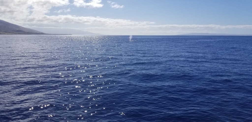 A puff of water on the glistening sea is all I captured of this whale before I put the phone down.