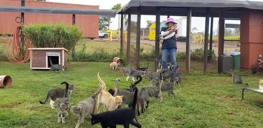 Has it happened that you saw something on Facebook, and years later, it still stuck in your mind? That happened for me when I saw the Lana’i Cat Sanctuary posted several years ago. The founder, Kathy Carroll, was dismayed about the number of feral cats running all over the island. Having the cats at the sanctuary not only cares for their health but also controls the numbers, and protects the bird population. There are over 600 cats at the sanctuary. Seeing it on Facebook was one of those “ohhh, I wish I could visit” moments and I was purely tickled that I could see all those cats, and the sanctuary, in person!
