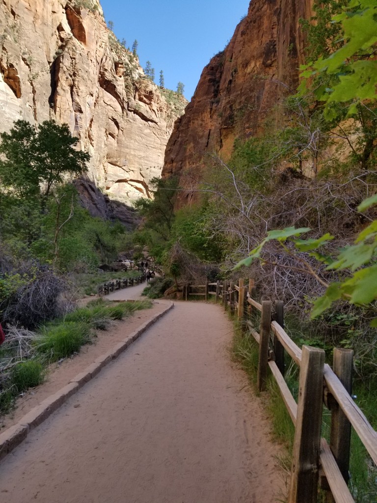 The two most popular trails at Zion are Angel’s Landing and the Narrows. Although strenuous because it is a high altitude climb up the rocks, Angel’s Landing now requires a permit because the trail has often been so crowded. Riverside Trail leads right into the Narrows, where the cliff walls rise high above the river on both sides. The hike is totally in the Virgin River, and it’s possible to follow it for several miles. That would have required us to rent equipment, something we did not want to do on this Zion exploration day.