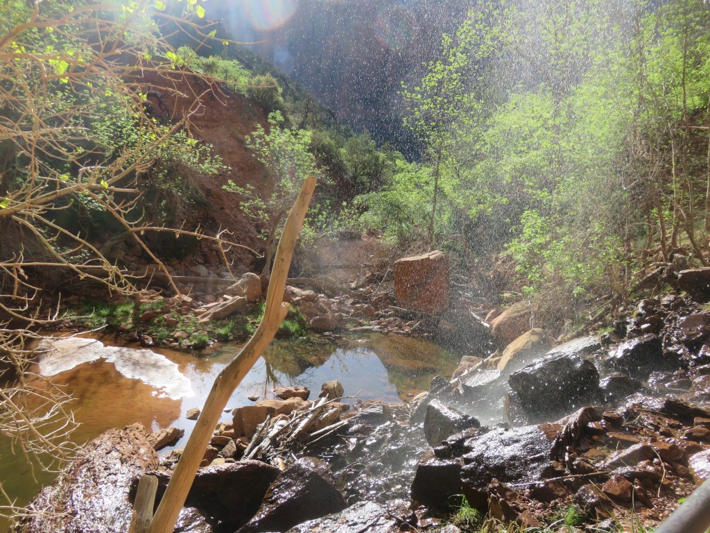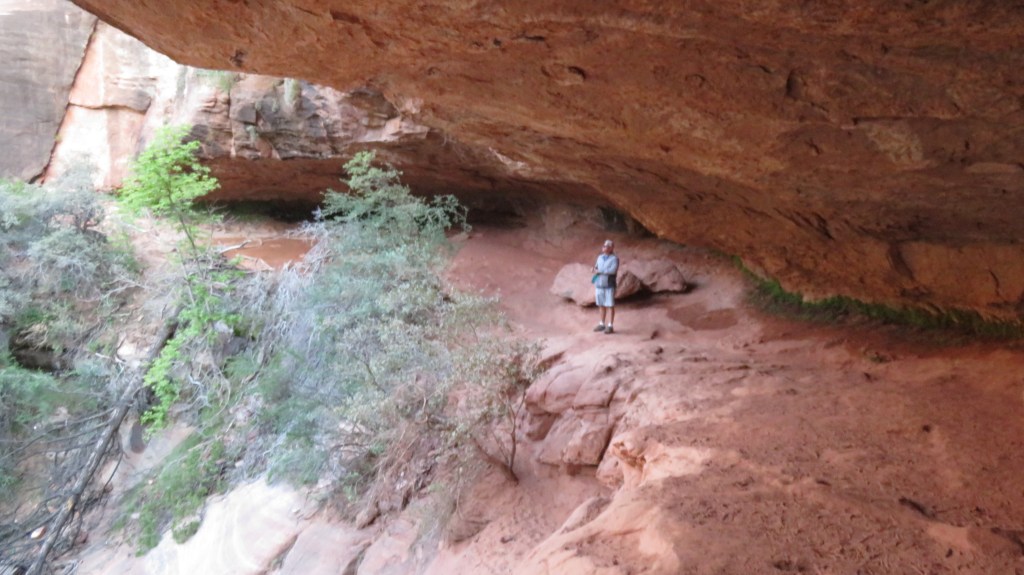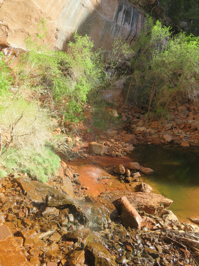 The water dripping from the high cliffs glistened in the morning light. Emerald Pools is named for the color of the algae that grows here. At the top of the cliff are streaks in various colors; those are caused by water passing through the natural chemicals in the rocks. You can also see this effect in the photo at top of the blog.