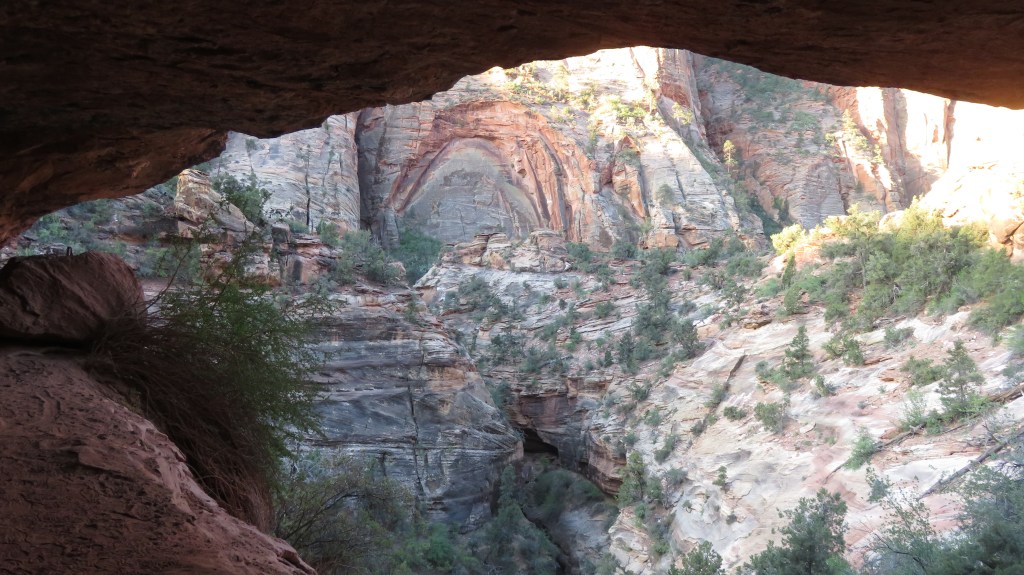 We were hiking above the narrows of Pine Creek, which forms a “T” with Zion Canyon at the end. There is a view of Zion at the top right of the above picture, and the road we would be taking into it. Looking back on this hike later, we were so glad we did it. It felt the most like our normal hiking in nature, had the fewest people, and was the only one that we went on all day that wasn’t either nicely paved or soft dirt. The morning was quiet, and the beauty was all around us.
