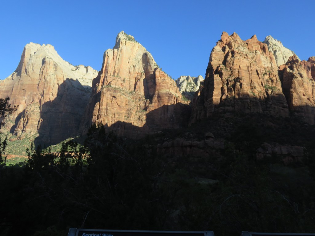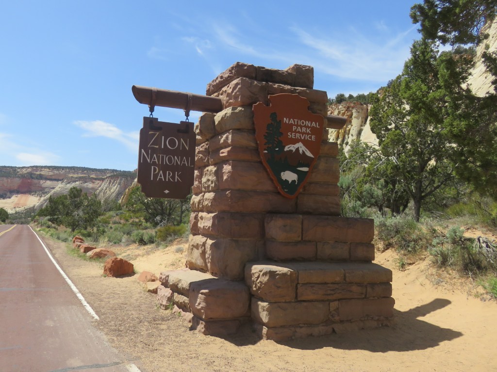 We set out for Zion, forty miles from our home, early in the morning when it was still dark. We’d heard about how busy the parks are, and it was a Saturday. This picture of the park and its sign were taken on the way out of the park, when we were going back home.
