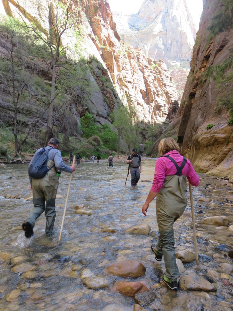 This couple is unwittingly modeling the equipment that can be rented for the Narrows: waterproof coveralls and backpack, shoes, and thick wooden walking poles. The rocks are large in the Narrows and I’ve heard the walk can be compared to walking on slippery bowling balls. In April, the water is waist deep farther up the canyon. It looks like great adventure. That’s for next time – if we don’t wait too many years to return, that is!