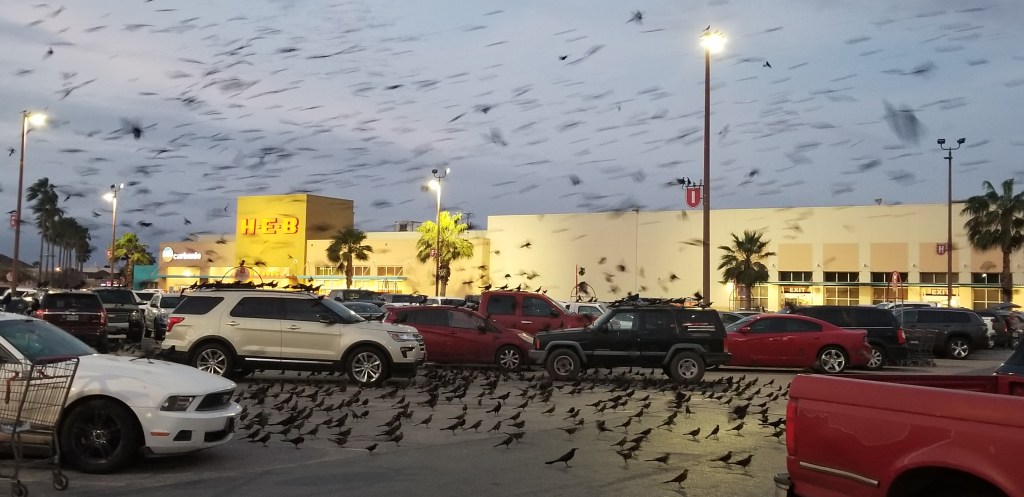Shopping at our local HEB one evening, the grackles totally took over the parking lot. It was raining birds! We even saw the parking lot on the evening news the next night. It was the time of year when grackles come from where ever they are all day and congregate. I guess even grackles like to shop at HEB.