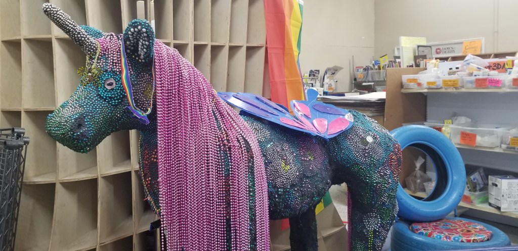 A purplish unicorn greeted us when we walked in the door. There was a list of things that had gone into its creation which I can’t remember now, but I’m sure it included toilet paper and paper towel rolls, and Mardi Gras beads.