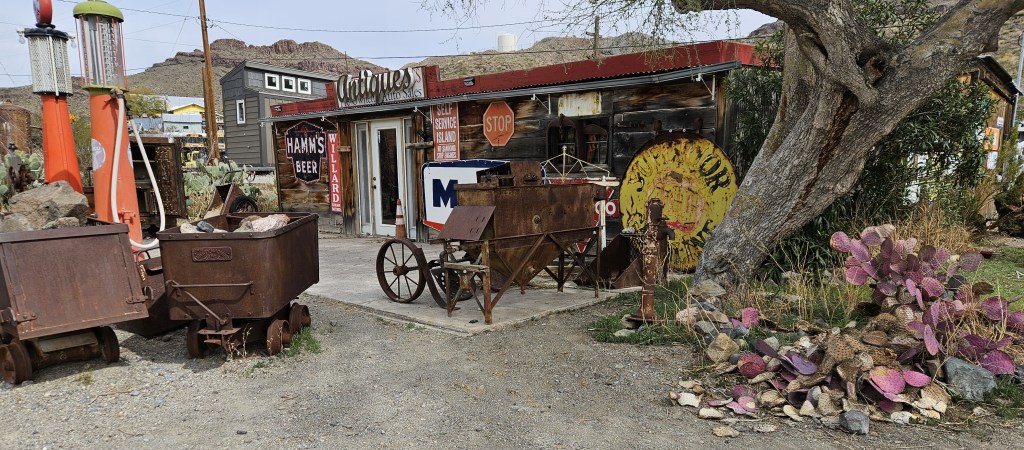 We came into Oatman in the morning, and nary a burro was to be seen. It was a cool morning, and I was told that they like to laze about when it’s cool and come into town when it warms up. So we walked through the craft and trinket shops, and looked at all the varied items that an antique store had sitting outside.