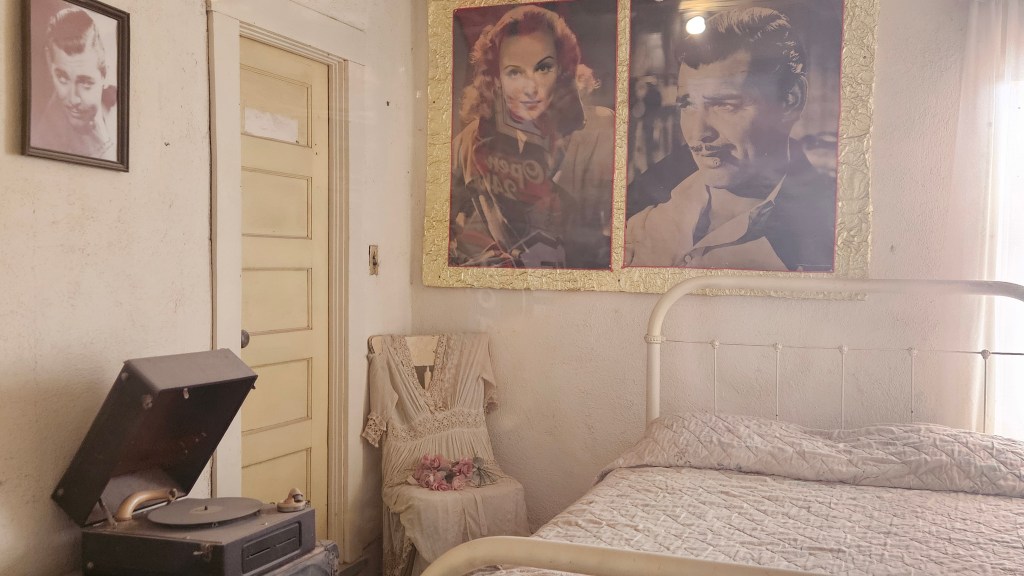 After that extremely satisfying meal, we went into what I think was formerly the lobby but now has a soda counter selling ice cream. Despite all that moussaka, there was room for ice cream. A precocious little girl sat on one of the stools, swinging her legs as she chatted us up. She told us that it’s not possible to stay overnight in the hotel any longer. But we could go upstairs and look in the room where Clark Gable and Carole Lombard spent their honeymoon night after being married in Kingman. Of course we had to take a look after receiving her excellent tourist information.