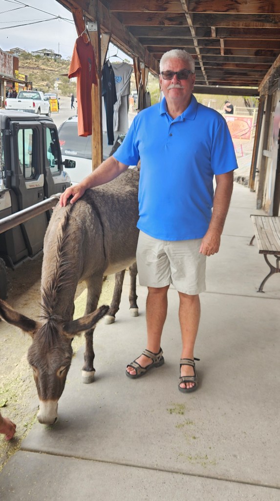 Route 66 was bypassed after Interstate 40 was constructed. The town may have died but for the thing that keeps it on the map: the burros that wander around town. When the mines closed, the workers turned their hardworking burros into the hills. The burros became feral, and burros did what burros do – they multiplied. They were used to being fed, so they wandered through town looking for handouts. Now, of course, everyone wants to feed them, and the shops sell mule food.