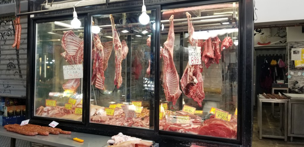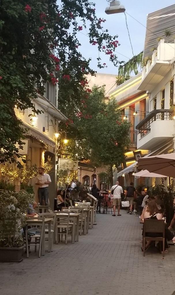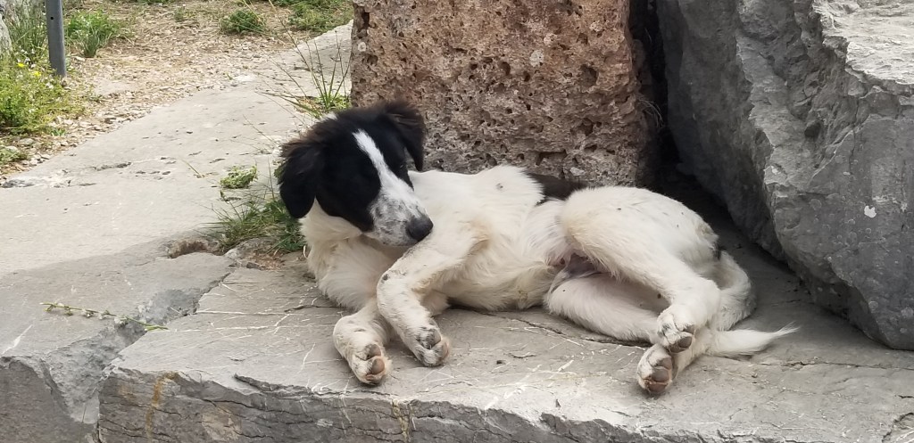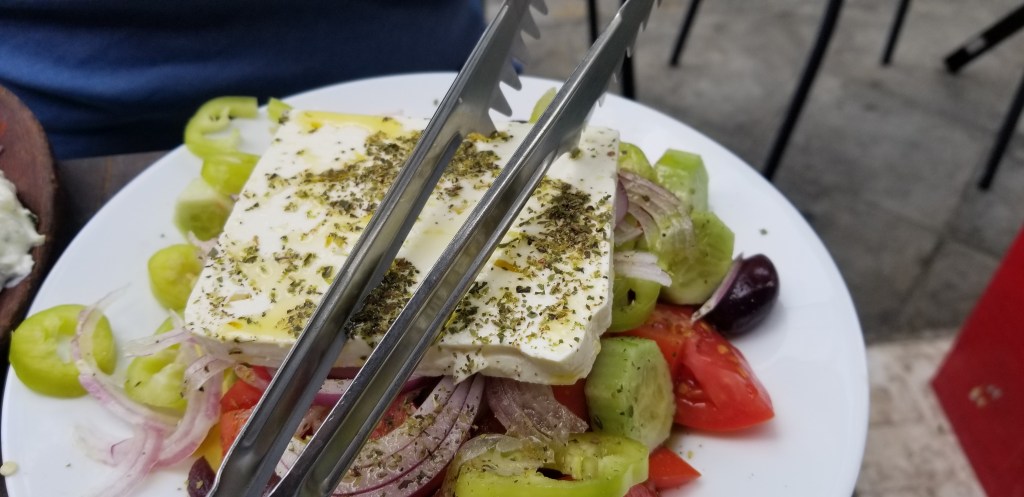 It was time for lunch, so for that we went into the village of Apiranthos. It is a village where the streets and archways are constructed from marble. We had a delicious lunch on a simple patio overlooking the valley while my feet were planted on a marble floor. A local cat placed herself there as well, looking at me hopefully during the entire time I ate my meal. Her wait was not in vain. She and I dined on a meal of roasted pork, spaghetti with a tomato gravy, and a salad with a local soft goat cheese called xinomizithra.