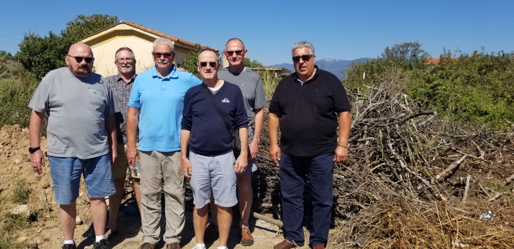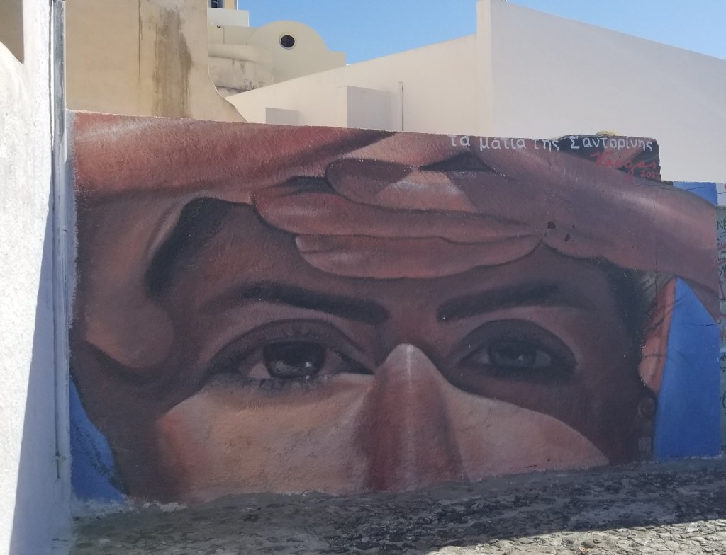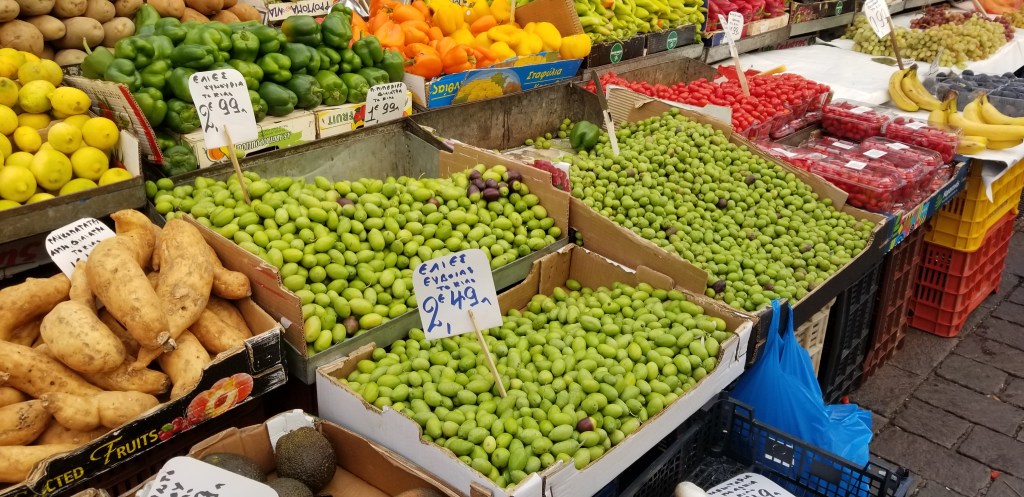 We headed out into the countryside. Olive and cypress trees dot the rolling landscape which is bordered by low stone walls. Old buildings in various states of decay can be seen here and there, and, up on distant mountaintops, ruins of Venetian castles. The valley is fertile and, besides olives, produces potatoes, fruit, wine, honey, and cheese. Small wonder, then, that the god that the ancient Greeks worshipped here was Demeter, god of harvest.