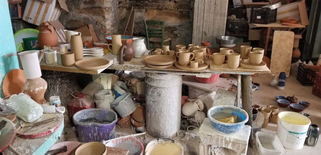 On to a little pottery shop, where the potter demonstrated his craft on a wheel. As he works, he throws excess bits of clay on the wall- his “wall art” is at left.