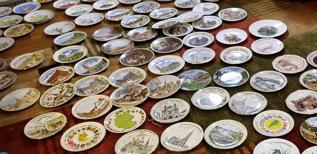 Cal and I have been married for almost 41 years, and as late stage baby boomers, I’ve always been amazed at how, unintentionally, we fit into the demographics of our age. We accumulated in our 20’s and 30’s, aided by two 4 year (almost-) stints of living in Germany. I was delighted at all the things I could purchase while living in Europe. Not only that, but while there we did a lot of volksmarching. There were volksmarching clubs all over Europe, but especially Germany. One weekend a year, a club would sponsor a self-guided walk around their town with a distance of either 10 or 20 kilometers. There was an award for completing the walk, and they would publish a brochure giving particulars of the walk with a picture of the award. On any given weekend, there were several volksmarches to choose from. The walk was a great way to see the countryside, and the food waiting at the end was to die for. I still remember the times I tucked into a nice warm bowl of thick soup with a big fat sausage sticking out from the bowl, a hearty slice of rye bread, and a choice of home-made tortes for dessert…mmmm….but I’m digressing. The first time we were there, the awards were mainly decorative medals. By the second time, the awards morphed into plates, beer mugs, various souvenirs, often locally made. All total, we had over 100 beer mugs, countless decorative plates and other volksmarching trinkets, plus a cuckoo clock, Christmas pyramid, nutcrackers (2 of which were bar stools), other European tchotchkes, and a huge wall unit called a “schrank” to put it all in.