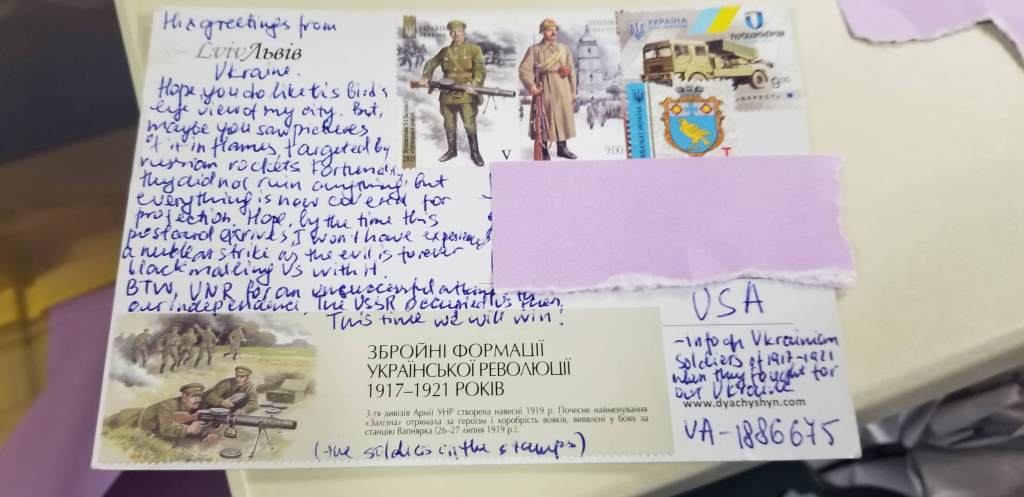This poignant card from Ukraine made me sad and I hope by now that the city portrayed on the front of it hasn’t been bombed to smithereens. The sender wanted me to know that this is not the first time in history the Russians have invaded and that, eventually, Ukraine will be victorious.