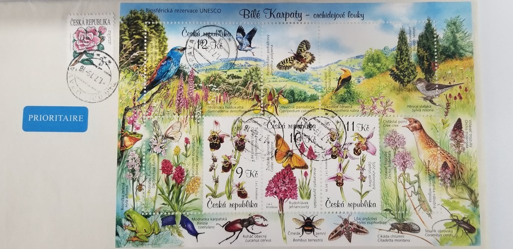 Speaking of stamps, sometimes the sender overloads me with a lot of beautiful ones on the card. Many people in Postcrossing collect stamps, too. The sender of this postcard from Czech Republic put the card in an envelope and covered it with a whole page of stamps. Wow!