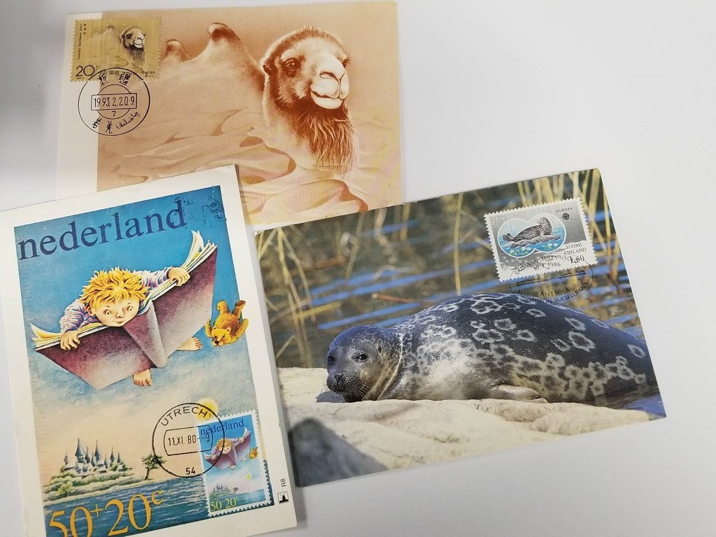 I’ve learned a little bit about postcards along the way, too. Maximums (maxi cards) are postcards that have a stamp on the front that matches the view on them, usually to commemorate the first day of issue. I’ve received many of these from Australia, and other countries too. I know that the post office in Australia sells them, but I don’t know if that’s the same in the others. The United States Post Office does not sell maximums. These cards from China, Netherlands, and Finland are some of my favorite maxis. Maxis are on my profile as a type of card I like to receive.