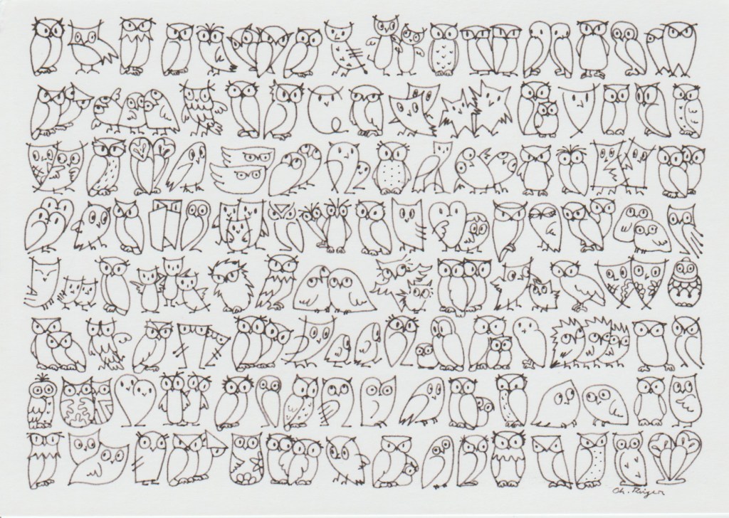 His mother drew all these little owls! The envelope also held a business card-size beautiful photo of the Water Castle in Hamburg at night – a tea and treat shop was advertised on the back – and there were stamps of historic half-timbered houses on the envelope.