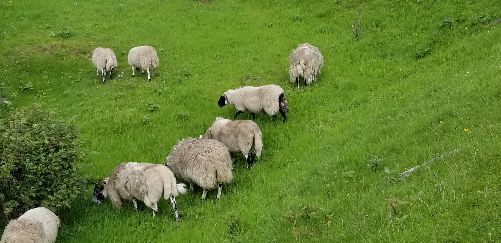 On the journey north, we saw herds of cows and sheep. It was funny to watch them run in panic away from the train. After all, it comes through at least twice a day! The white black-faced sheep dotted bright green pastures. The train also disturbed a little horned roe deer, which suddenly leaped out of the tall grasses. Two different flocks of swans graced a small winding river. A castle could be seen high on the cliffs in the distance. For awhile we rode along the sea where there were massive kelpy flats where the tide had gone out, with horses in a meadow on the shore.