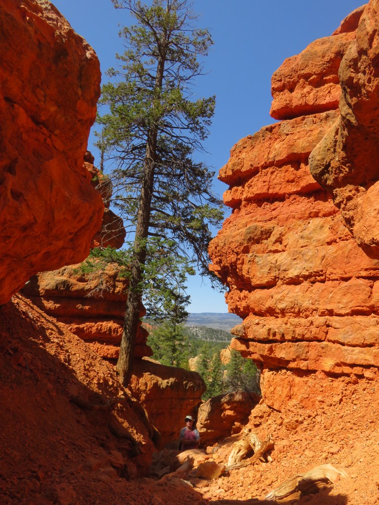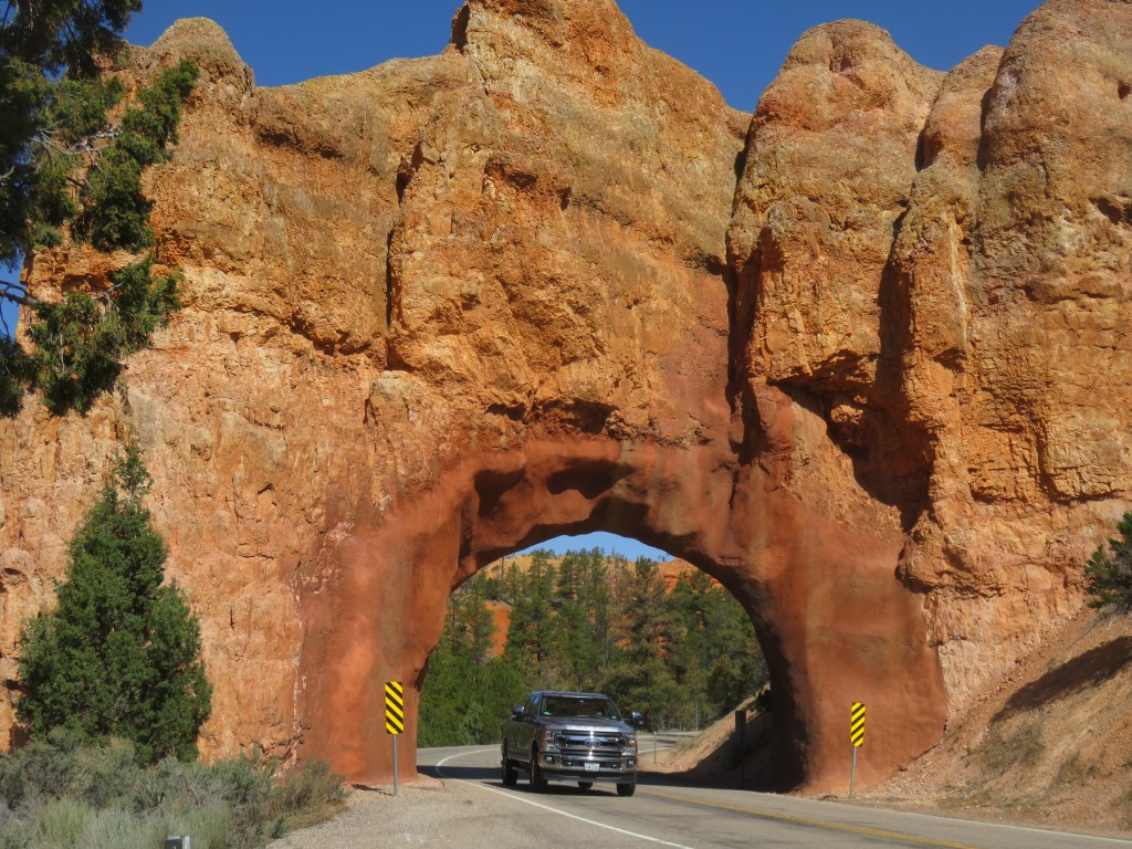 The tunnel that struck such fear in me was in Red Canyon. There were mixed emotions going on here: besides the tunnel, we were suddenly in the middle of the most amazing landscape: hoodoos and rock spires of brilliant red sandstone set against the green pines. It wasn’t too far from where we were staying, so a visit (without the RV) was the first thing Cal wanted to do the next day.