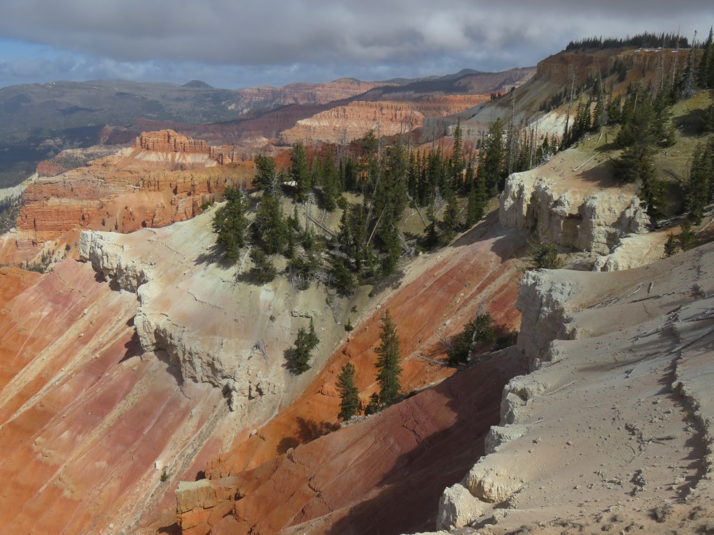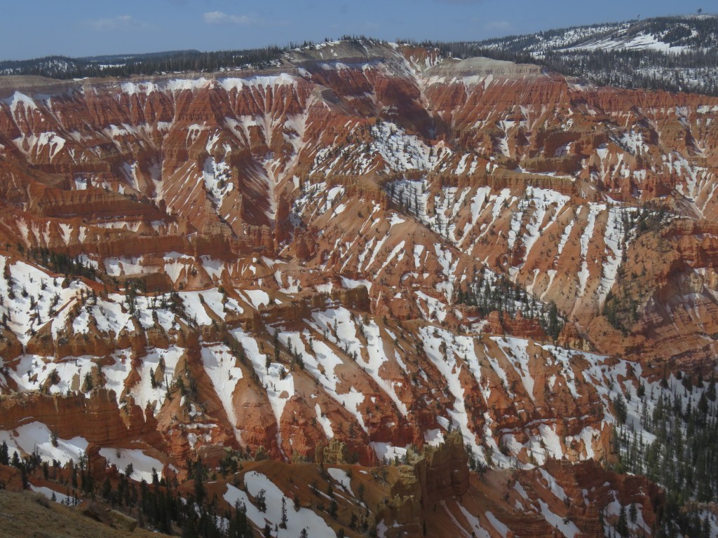Cedar Breaks is a natural amphitheater which looks a bit like the Grand Canyon with some hoodoos thrown in. It sits at 10,000 feet above sea level, a fact we may not have thought enough about when planning to visit. It was early May and the road to Cedar Breaks had only recently been open for the summer. It is covered in snow and impassable through the winter. We chose the coldest day of our Bryce area stay for a visit to this park, reasoning that if it was too cold we’d just enjoy the drive in the truck. It was 55 miles from where we were staying.