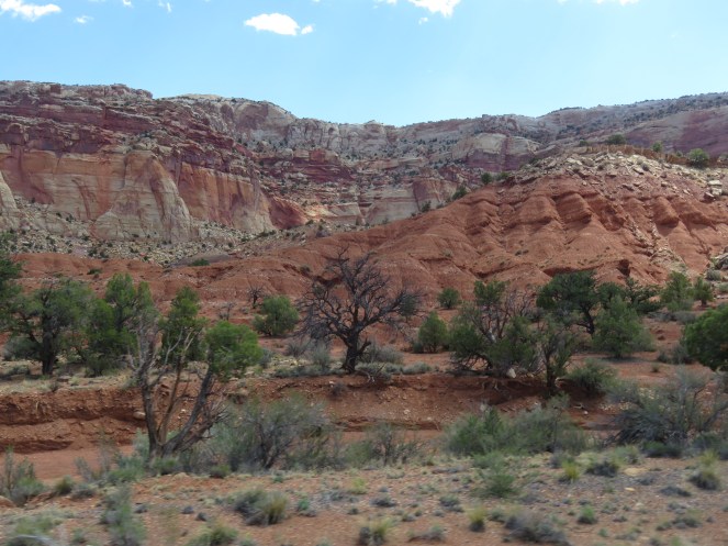 Passing through Fruita and only stopping at the Visitor’s Center at the beginning, we drove the 16-mile round-trip Scenic Drive. On our left was the face of the Fold; on our right was desert scrub. The picture at the top of the blog shows the abrupt change in the landscape.