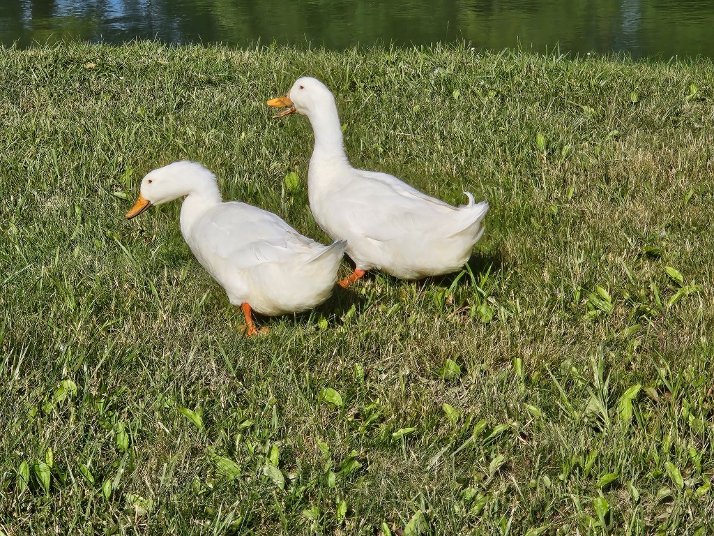 This pond was closely guarded by a pair of watch ducks. As you can see below left in the above picture, they are snoozing on the job. Every time I walked by, they would fuss and cluck to let me know they didn’t approve of me getting close, even if I wasn’t close. I saw them one morning pecking on the glass office door. A few minutes later, someone came out with a bucket of feed and dumped it by their tree. It was a feast for the squirrels when they were finished!