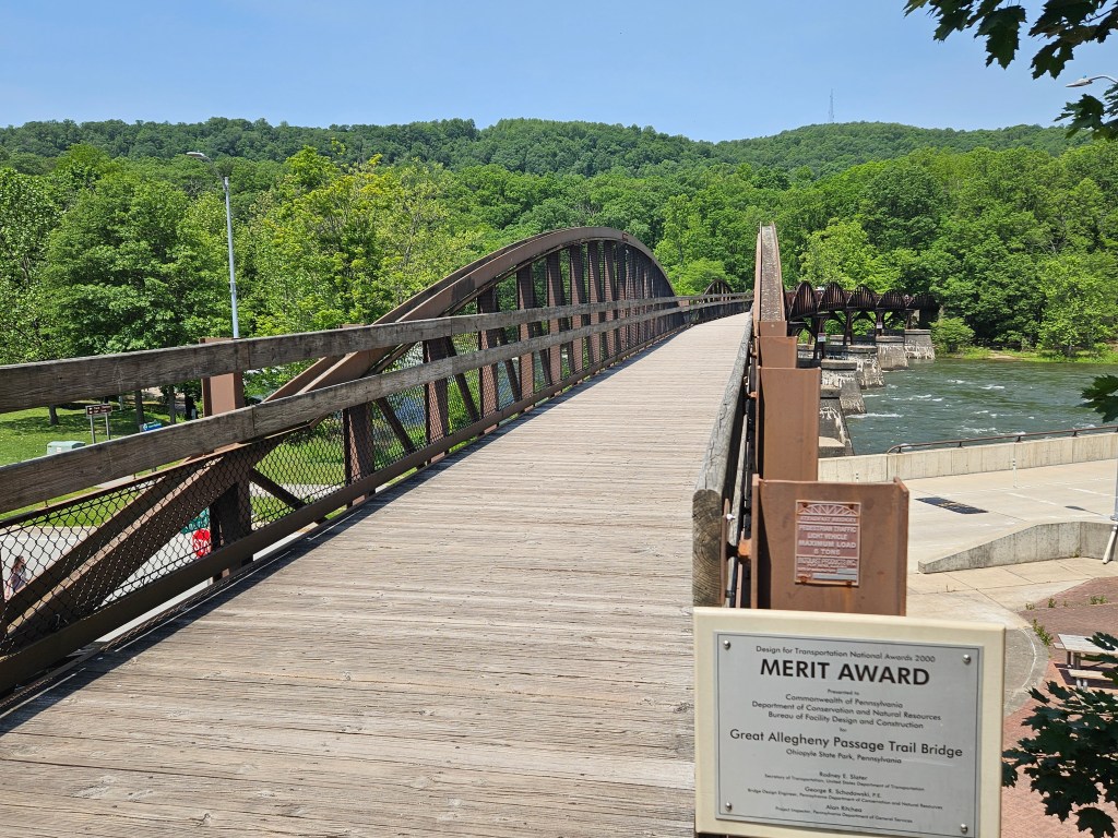 When the rail line was originally built, it brought passengers from Pittsburgh for a dollar. Resorts and all manner of entertainment lined the river. Eventually, as automobiles replaced the train, the resorts were torn down and the forest has been allowed to regrow and become Ohiopyle State Park. The rail line is now a 150-mile hiking and biking trail, renamed the Great Allegheny Passage Trail.