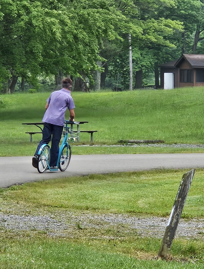 There was an Amish encampment here with a lot of kids. Perhaps there was more than one family. As I walked by, they had a huge pile of bikes behind their tent. Instead of seats, though, they had skateboard platforms. I’d never seen these before. A young man unwittingly demonstrated how they work as he flew all over the campground.