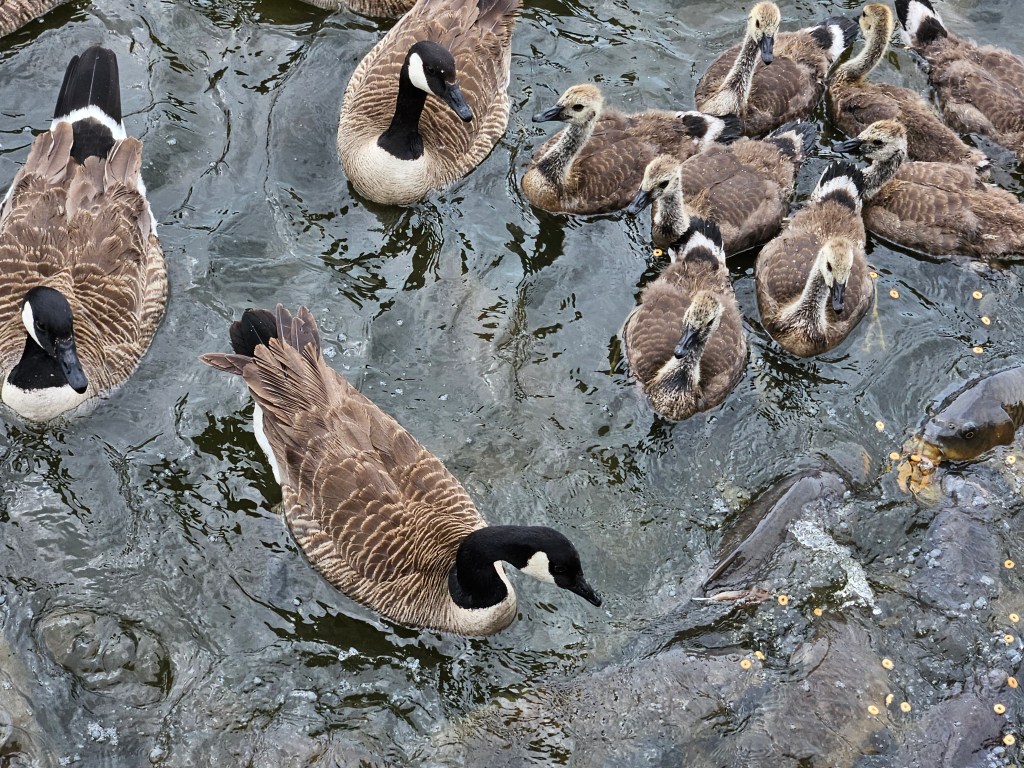 The fish are carp and there were a lot more geese than ducks, but that is something that changes with the seasons. There were SO many geese, and SO many big fat carp all vying for a bit of bread…or Cheerios.