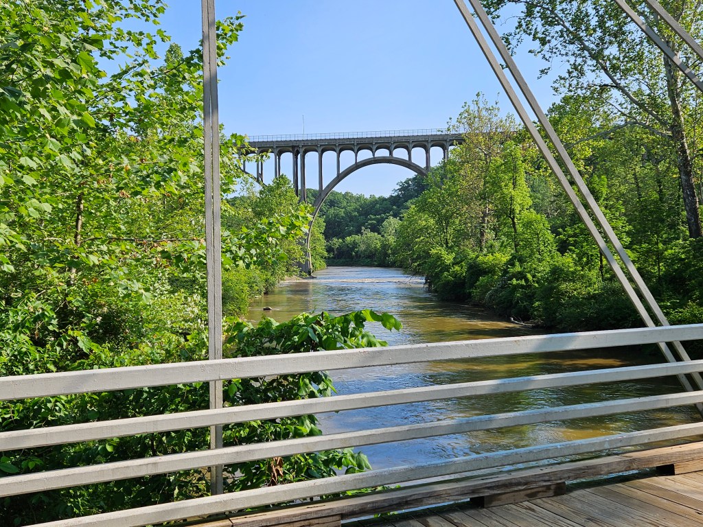 No worries, we rode on the Ohio-Erie Canal towpath nearby and although we were a shade disappointed that the bikes didn’t get to ride a train, we had a great bike ride. First, we had to cross the 100-mile Cuyahoga River, the centerpiece of the park.