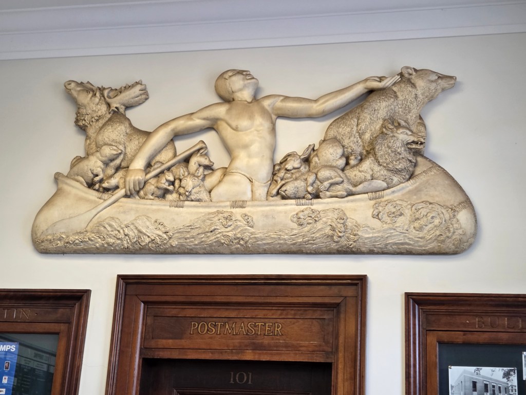 It is a plaster sculpture titled “Chippewa Legend” done by Hugo Robus and, like the others, is from the New Deal era. I love all the detailed animals in it.