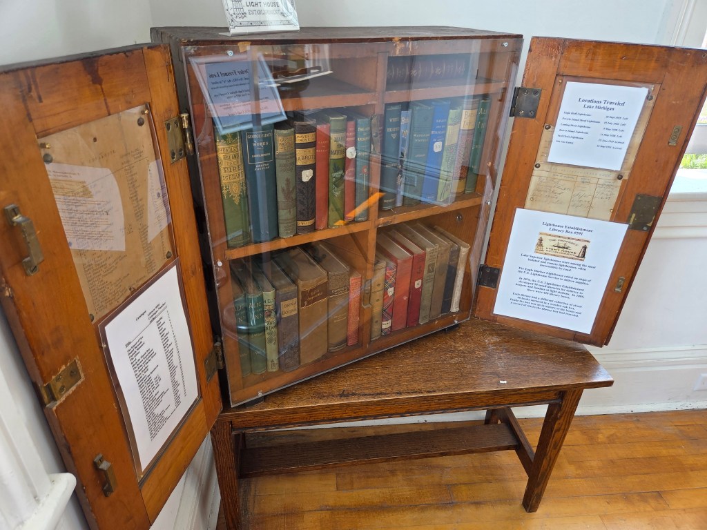 I found something interesting here: a traveling library. Lighthouse keepers eagerly awaited the boats bearing their supplies. There were many boxes containing libraries that were swapped back and forth between all the lighthouses. The boxes were numbered, contents catalogued, and a log was kept of where each box had been. Life here was very isolated, so I’m sure each box was eagerly awaited to get through a cold Superior winter. The picture isn’t good with a bad glare, but you can get an idea of what a box looked like.