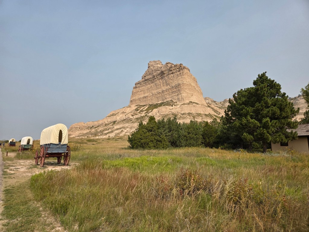Scotts Bluff National Monument was the first excursion our group took together. We listened to a ranger talk, watched a movie, and then were turned loose to go explore. The covered wagons lined up in the picture below are all sitting on the former Oregon Trail.