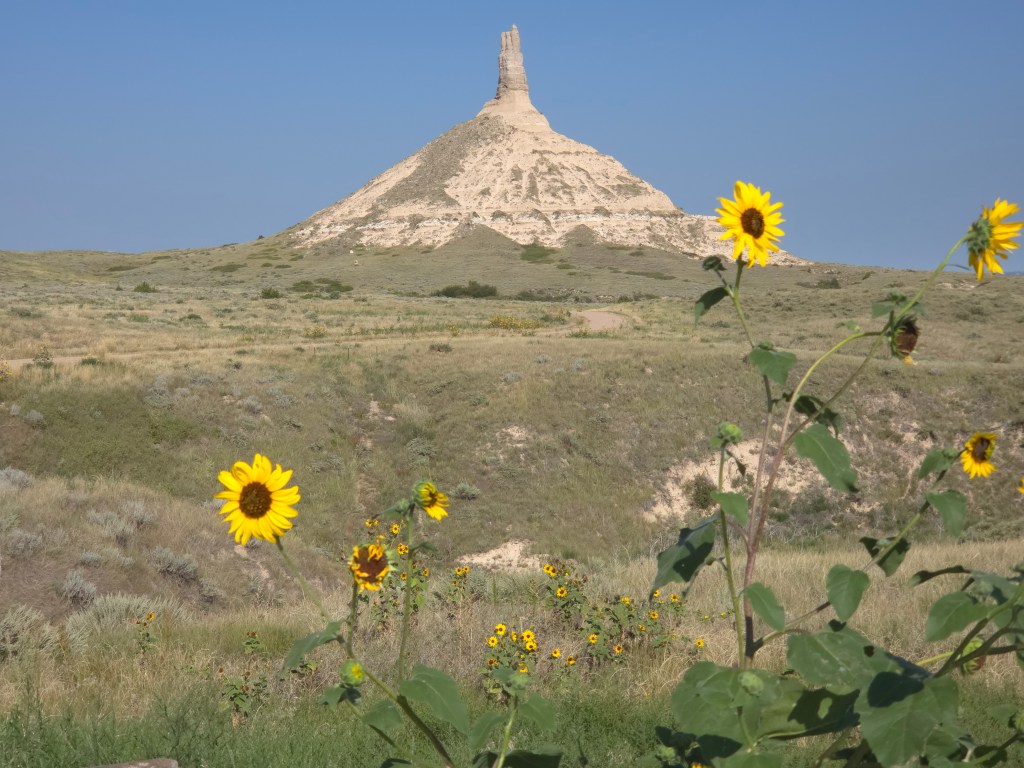 This rock, along with Courthouse and Jailhouse Rocks, were actually what the pioneers saw first when coming from the east. It let them know they were not far from Scotts Bluff. Chimney Rock is a state park and in the visitors center there are more exhibits about the pioneer story.